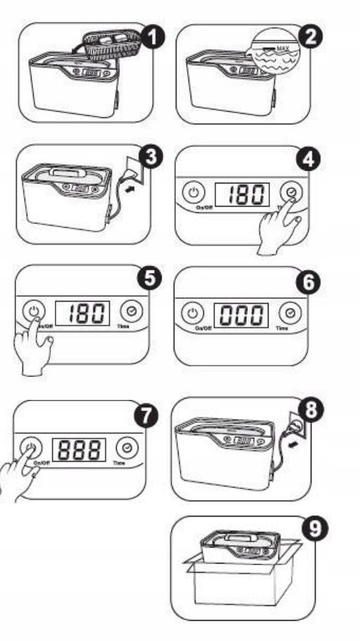 Nałóż wieczko na myjkę. Podłącz urządzenie do prądu – na wyświetlaczu pojawi się domyślny czas pracy „180s”. Ustaw preferowany czas mycia za pomocą przycisku (do wyboru: 90s, 180s, 300s, 480s, 600s). Naciśnij przycisk włącznika, aby rozpocząć czyszczenie. Myjka rozpocznie odliczanie czasu do zera.
